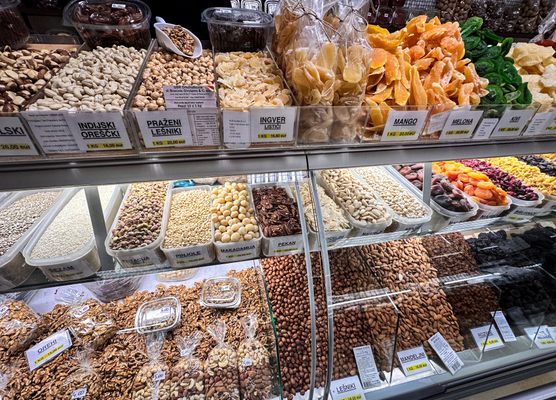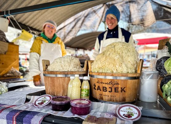 The fruit and vegetables are sold in open stalls—be sure to stop by the sauerkraut stall run by Marjetka Zabjek, a local legend whose family sells an indigenous cabbage that makes the best sauerkraut. You can also get sour turnip (which sounds kind of dreadful but is delicious, sauerkraut made with turnip instead of cabbage)—a perfect side served with sausage and dressed in cracklings, to warm you up on an alpine evening.