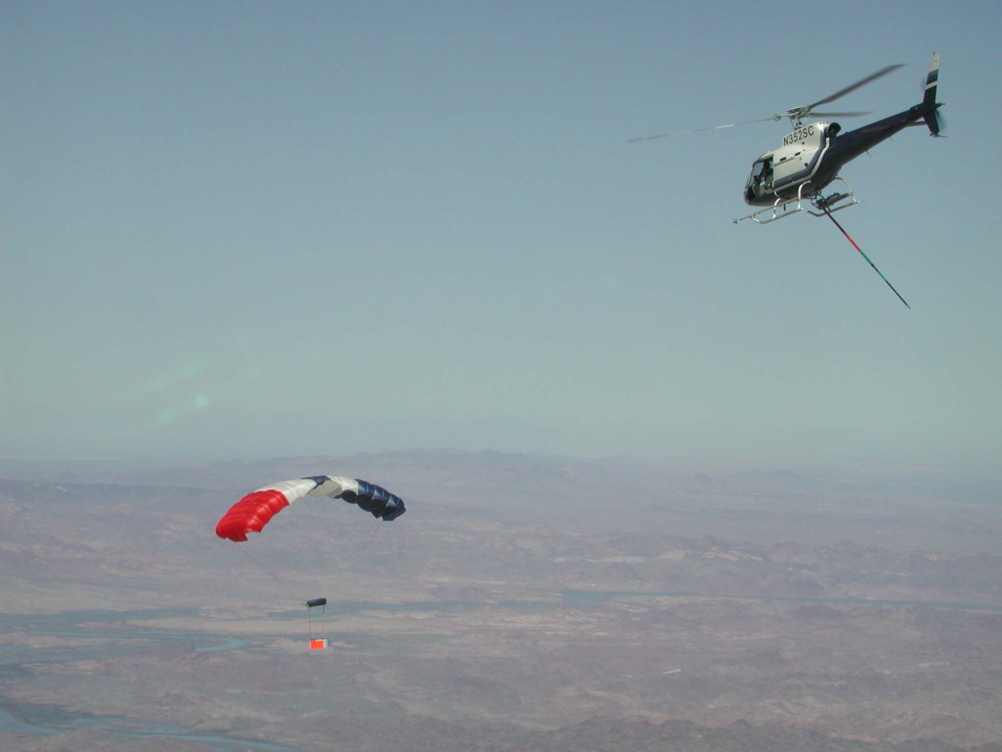 The men, all from the U.S. Air Force, opened the back of the plane and extended a set of poles with a rope and hooks at the end. Mitchell flew them closer, and the parachute disappeared under the nose of the plane.