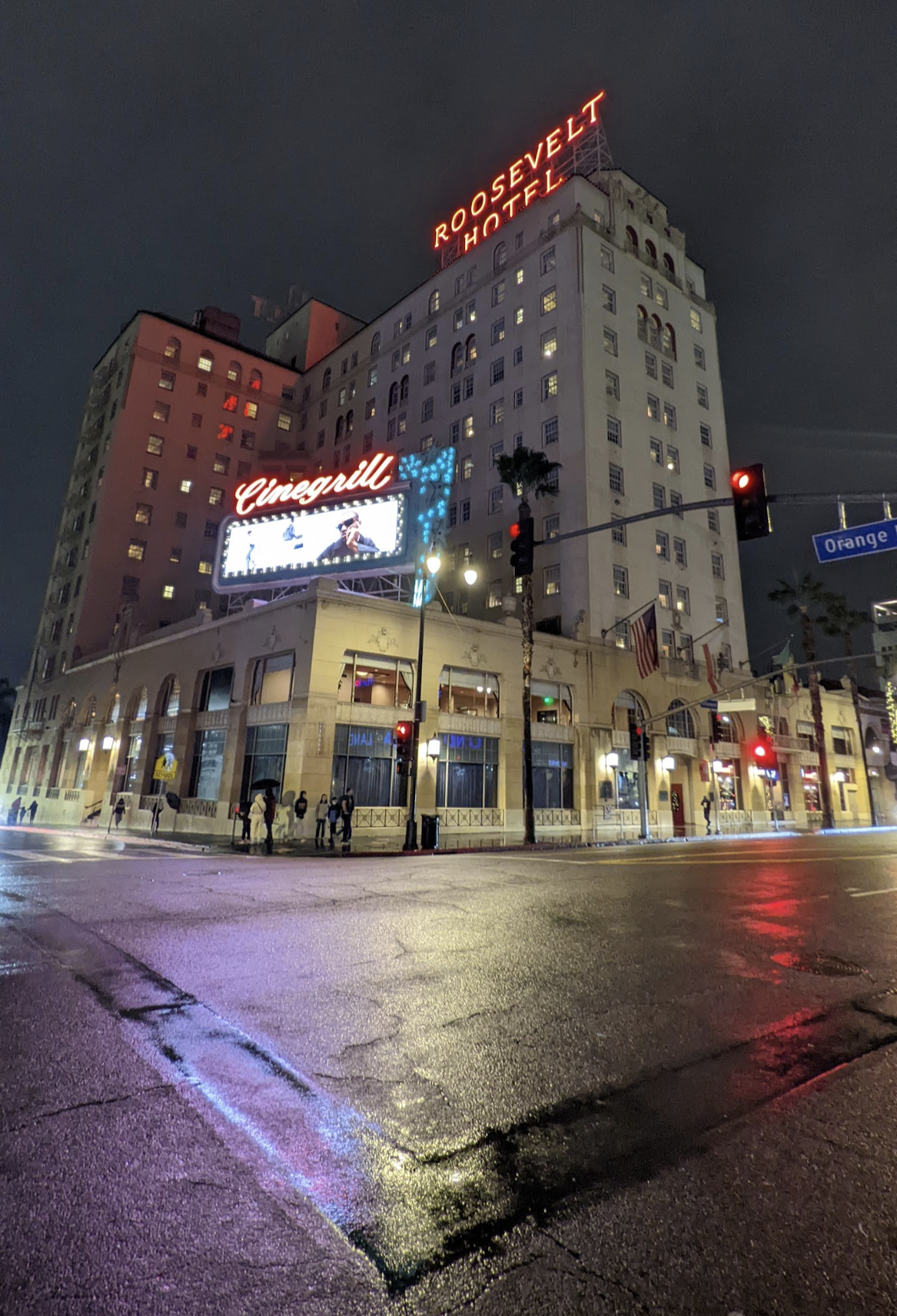 The 12-story hotel was built in a Spanish colonial style with elaborate chandeliers and wrought iron balconies. Hollywood is fundamentally a place marked by a need for glamorous spaces whether shooting locations, premieres, or awards ceremonies and the Hotel Roosevelt was an early attempt to capitalize on stars and glamour.